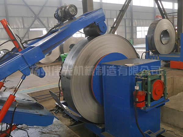 用途:用于承接帶鋼卷,并運送至開卷機,并將帶鋼卷托起至開卷錐頭中心,最大托舉卷重15噸。組成結構:由料架、行走機構、油缸、導軌等組成。